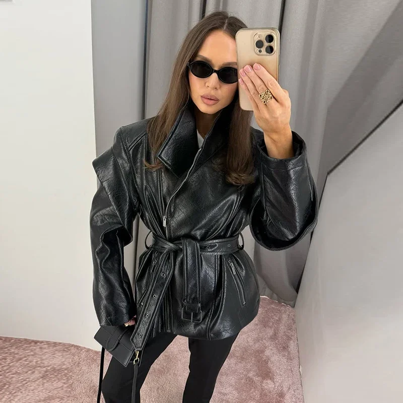 Step out in style this autumn with our Women’s Fashion PU Leather Jacket, designed for the modern streetwear woman. Featuring a turn-down collar, long sleeves, zipper closure, and lace-up details, this jacket is perfect for adding edge and sophistication to your everyday wardrobe.