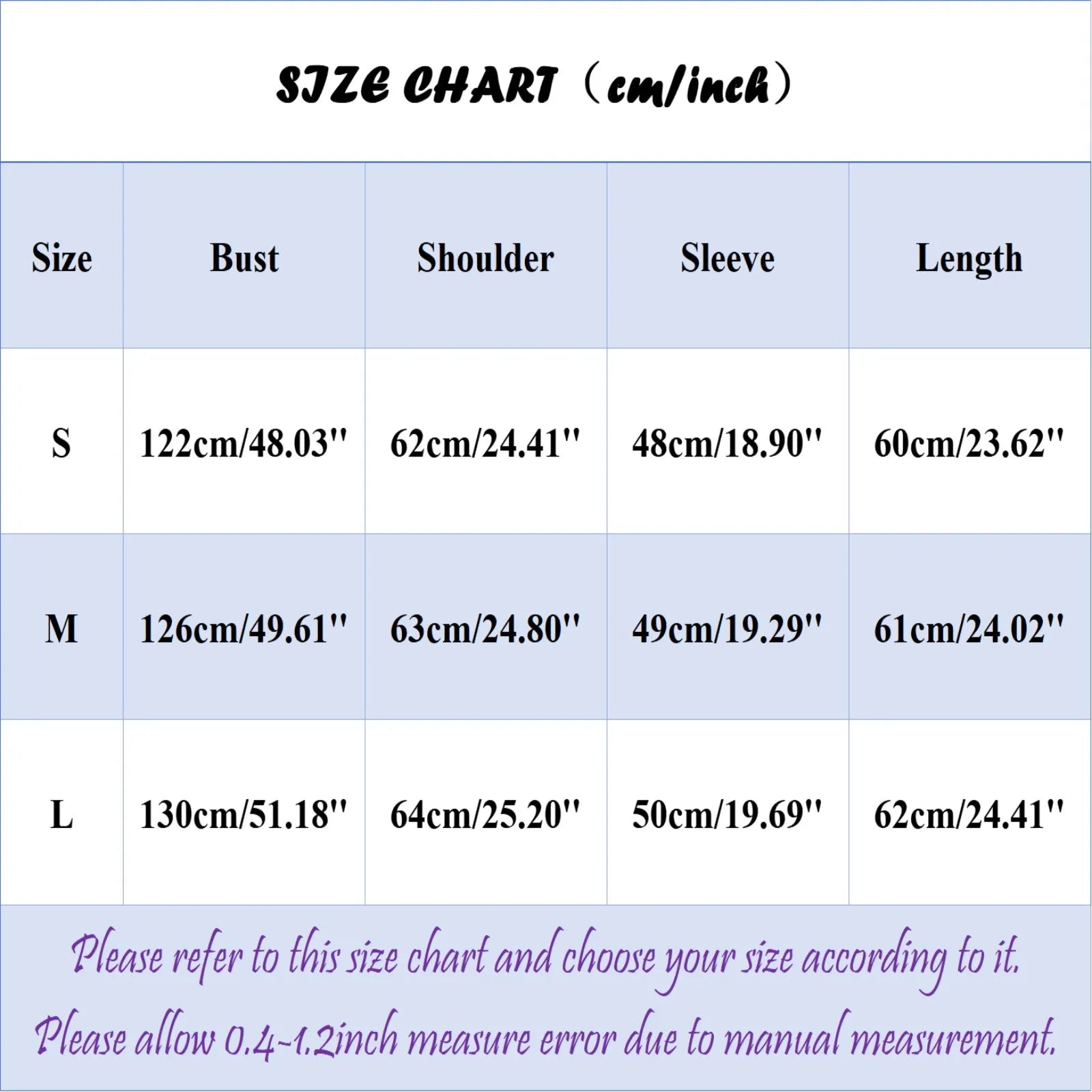 | Size:S | Bust:122cm/48.03'' | Shoulder:62cm/24.41'' | Sleeve:48cm/18.90'' | Length:60cm/23.62'' |