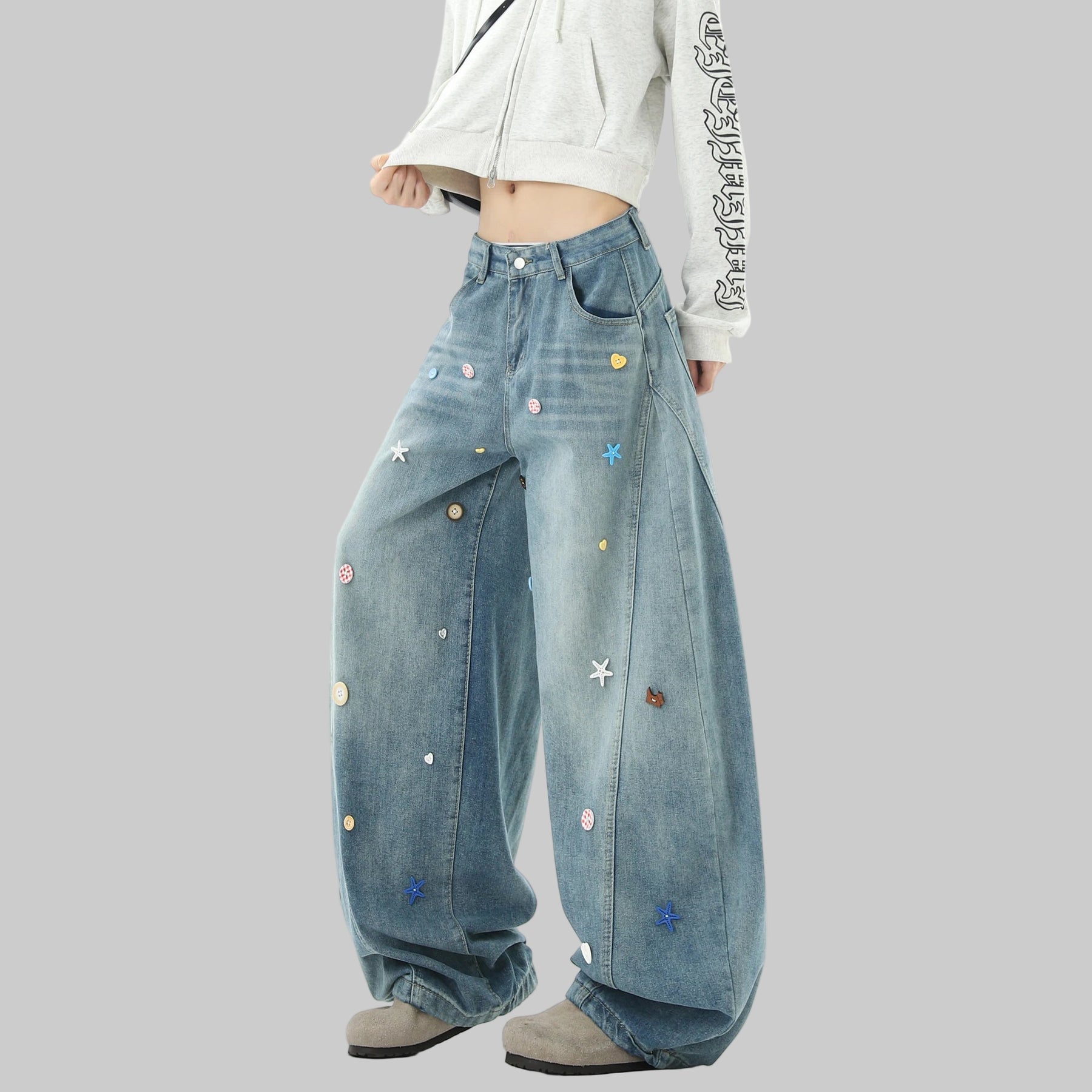 ✨ These aren’t just jeans — they’re a whole vibe. Baggy, patched, and star-studded for that next-level streetwear drip.