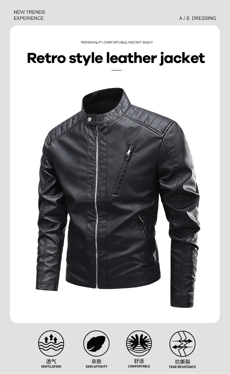 This trend-forward leather jacket is the perfect choice for men who want a mix of style, comfort, and practicality for daily wear or riding adventures.