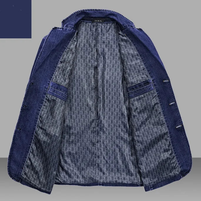 Elevate your style with our Men's Denim Blazer—a timeless fusion of comfort, versatility, and sophistication. Designed with a lapel collar and a classic three-button closure, this oversized blazer (up to 4XL) is perfect for men who want a confident, fashion-forward look without compromising on comfort.