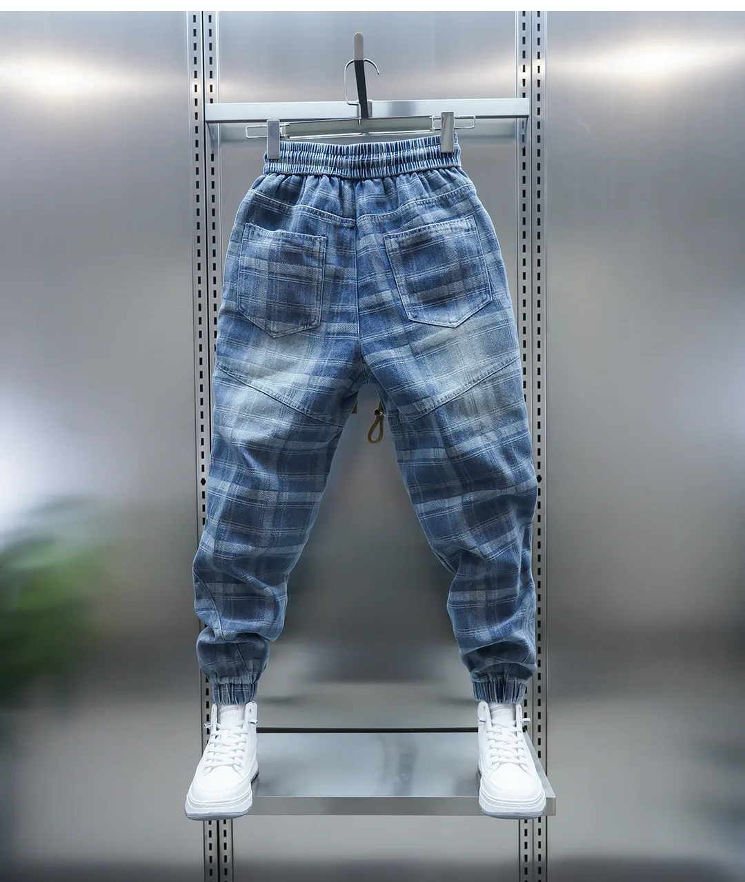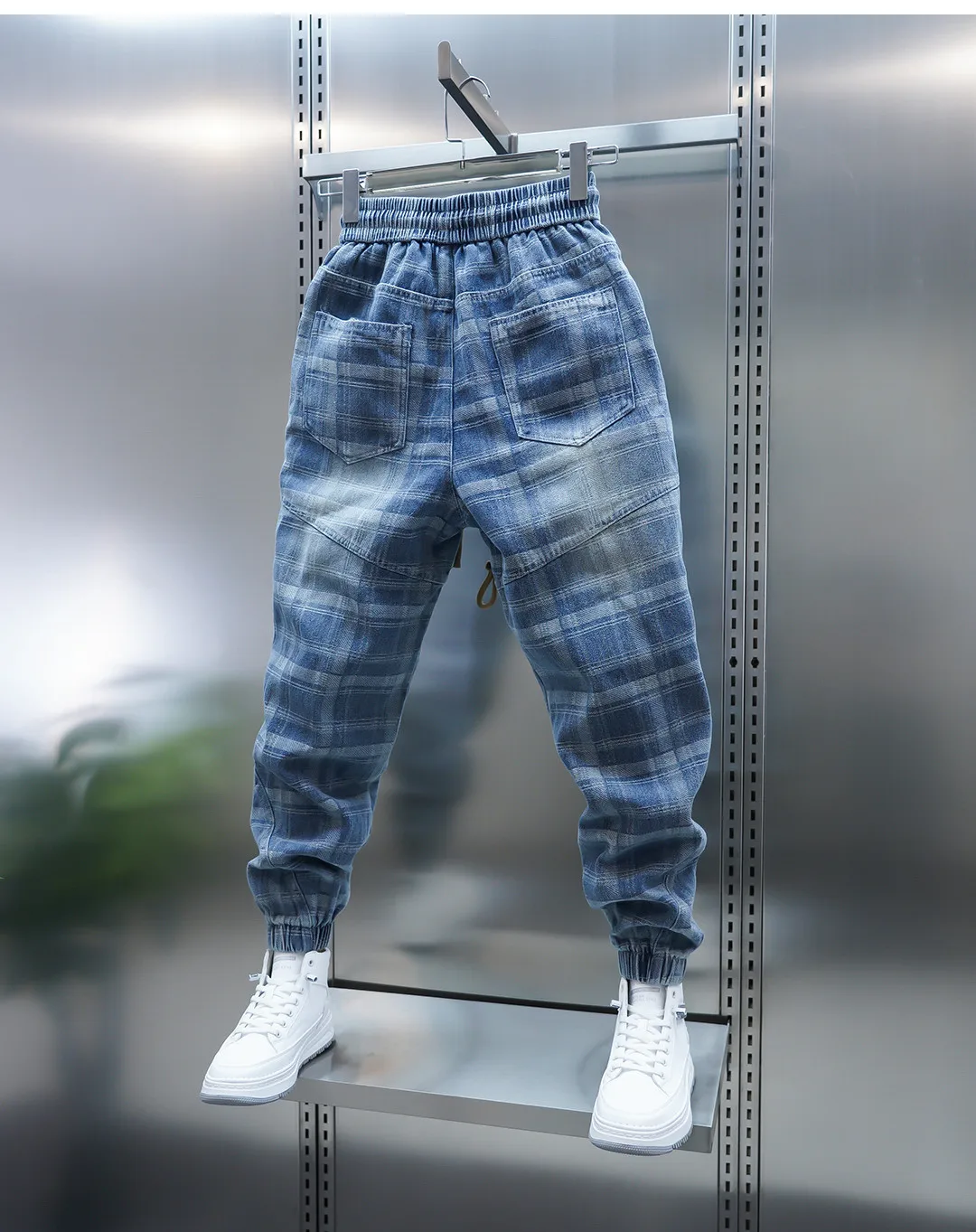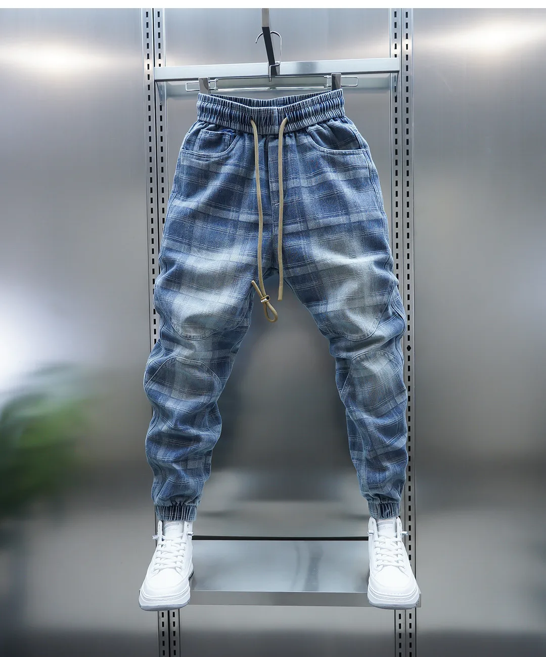Crafted with high-quality jacquard craftsmanship, the unique plaid patchwork design in light blue tones delivers a bold yet refined aesthetic. The elastic waistband with drawstring closure ensures a comfortable fit, while tapered legs highlight sneakers for an effortlessly sharp finish.