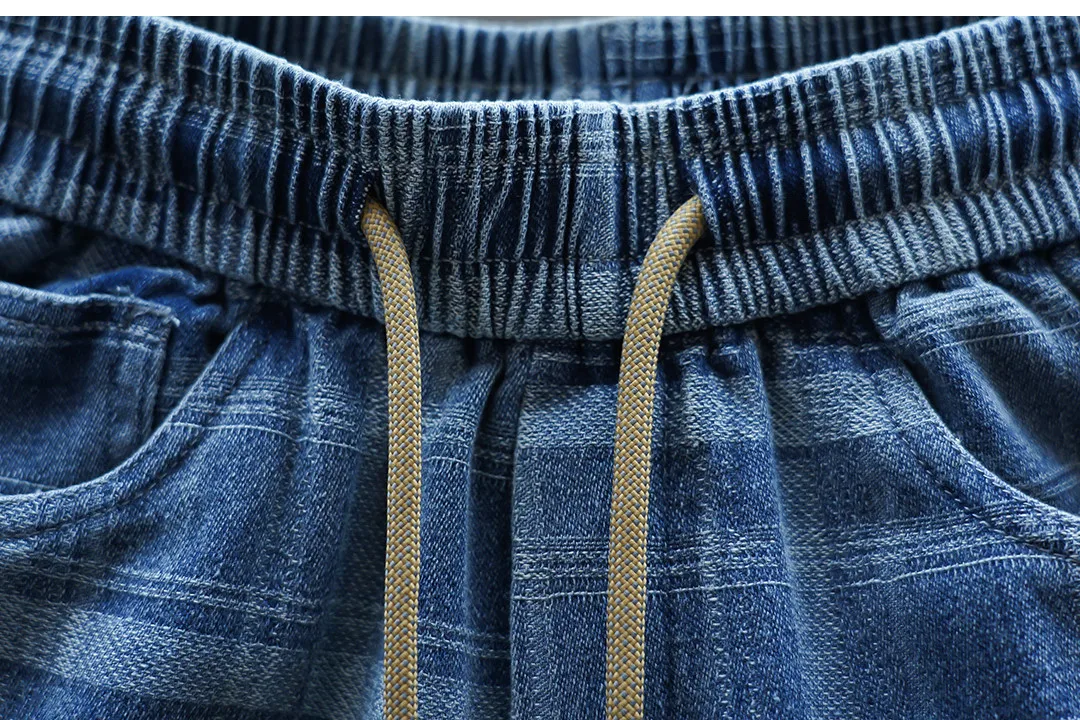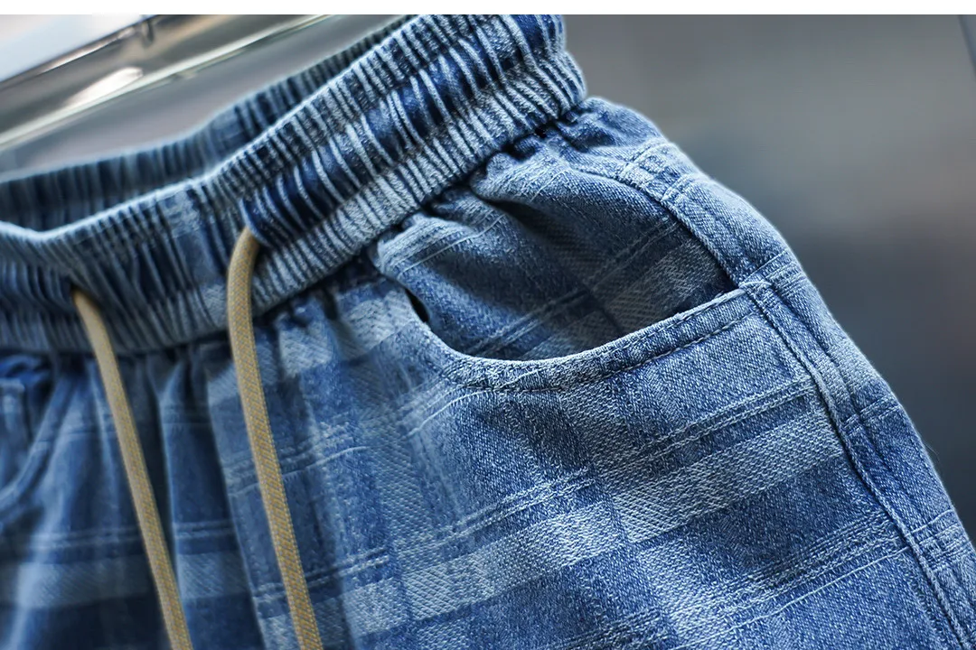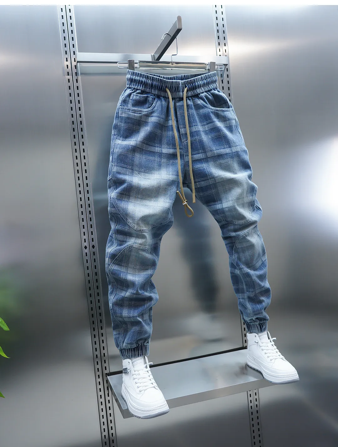 Crafted with high-quality jacquard craftsmanship, the unique plaid patchwork design in light blue tones delivers a bold yet refined aesthetic. The elastic waistband with drawstring closure ensures a comfortable fit, while tapered legs highlight sneakers for an effortlessly sharp finish.