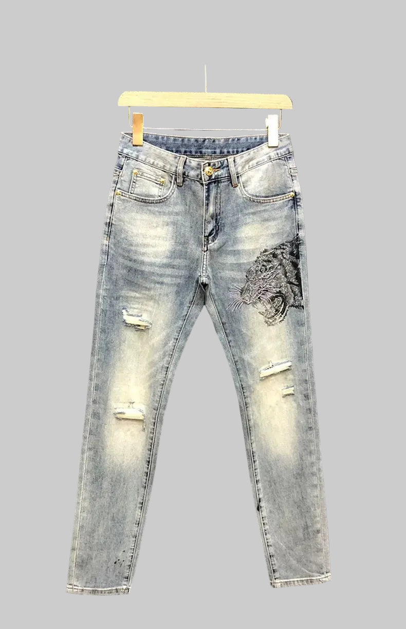 Unleash your inner rebel with our Y2K Gothic Ripped Cropped Jeans, designed to make a bold streetwear statement. Featuring a color-changing tiger head hot stamping, distressed detailing, and a straight cropped fit, these jeans combine retro punk energy with modern Y2K flair. Built for men who aren’t afraid to stand out, they’re the perfect fusion of comfort, durability, and edgy fashion.