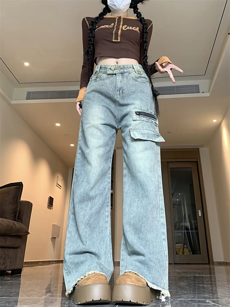 Serve pure cool-girl energy with these Women’s Double Button Wide-Leg Retro Jeans, a high-waist staple that blends vintage style with streetwear swagger. The double-button closure adds a trendy twist while securing a flattering fit, and the wide-leg straight cut delivers that relaxed, effortless silhouette loved in retro and Y2K fashion.