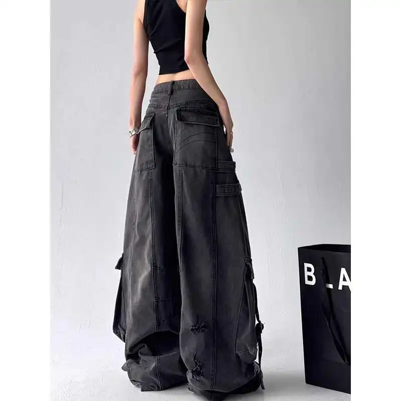 Women’s Deconstructed Black Wide-Leg Jeans – 2025 Spring Multi-Pocket Punk-Inspired Pants