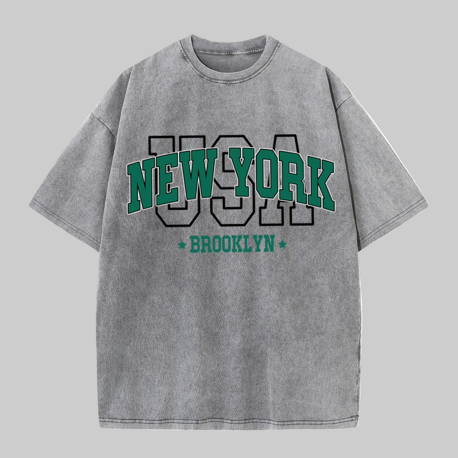 🗽 Cotton Washed O-Neck T-Shirt – Brooklyn USA Print