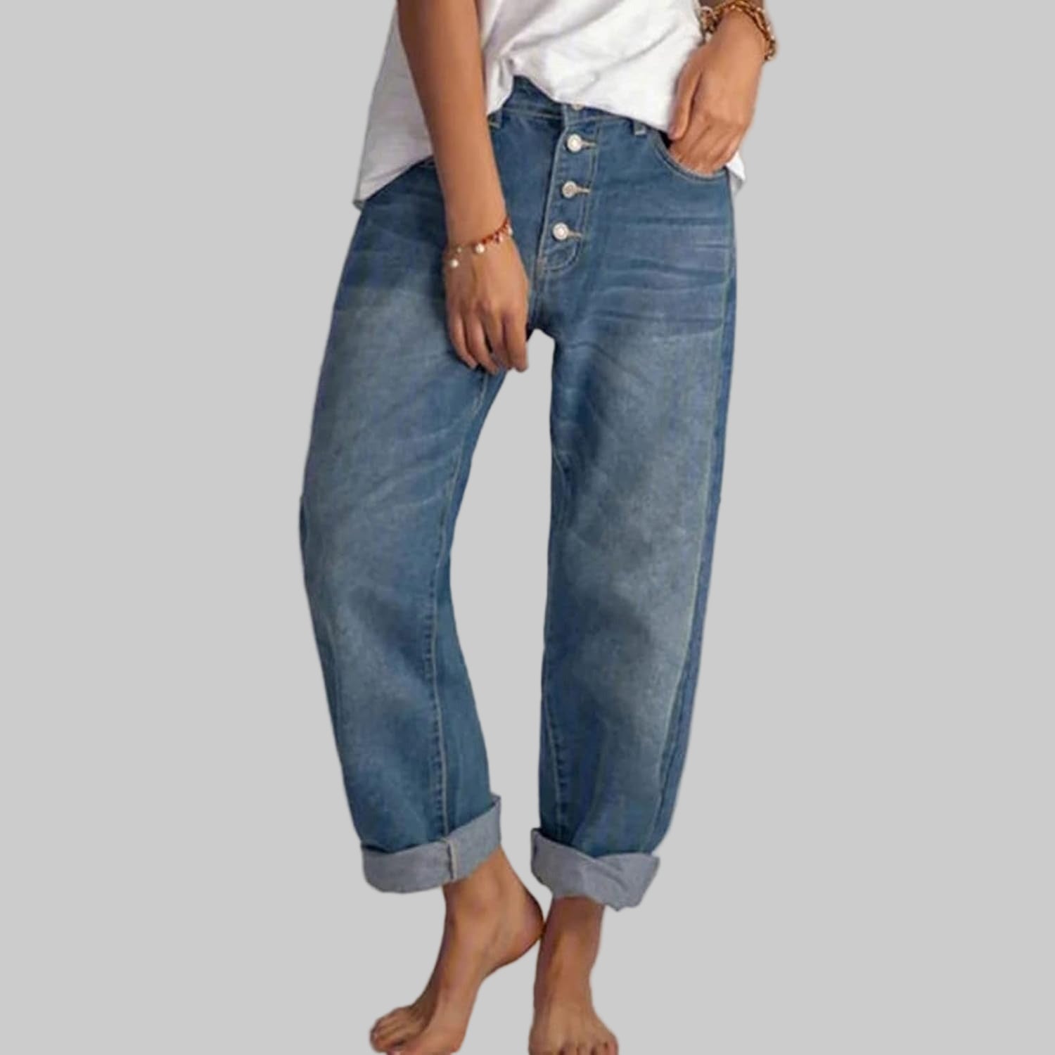 Meet your new favorite jeans—a perfect blend of vintage charm and modern comfort. Designed with a shaping high waist and a striking four-button front, these jeans flatter your silhouette while adding a touch of retro sophistication to your everyday style.