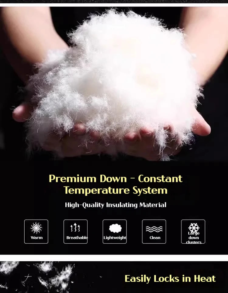 ❄️ Premium White Duck Down Filling Carefully selected high-quality white duck down with large velvet buds and high fluffiness locks in body heat without adding weight, bidding farewell to winter bulkiness.