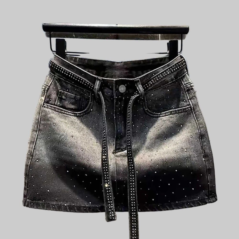 Add some sparkle to your summer wardrobe with this retro-inspired denim mini skirt. Designed with a gradient black-to-grey wash and shiny diamond rivet accents, this skirt perfectly blends edgy streetwear with feminine flair.